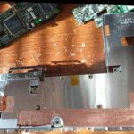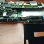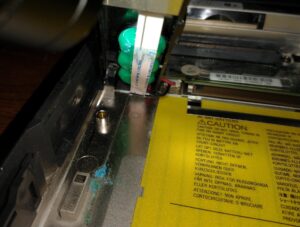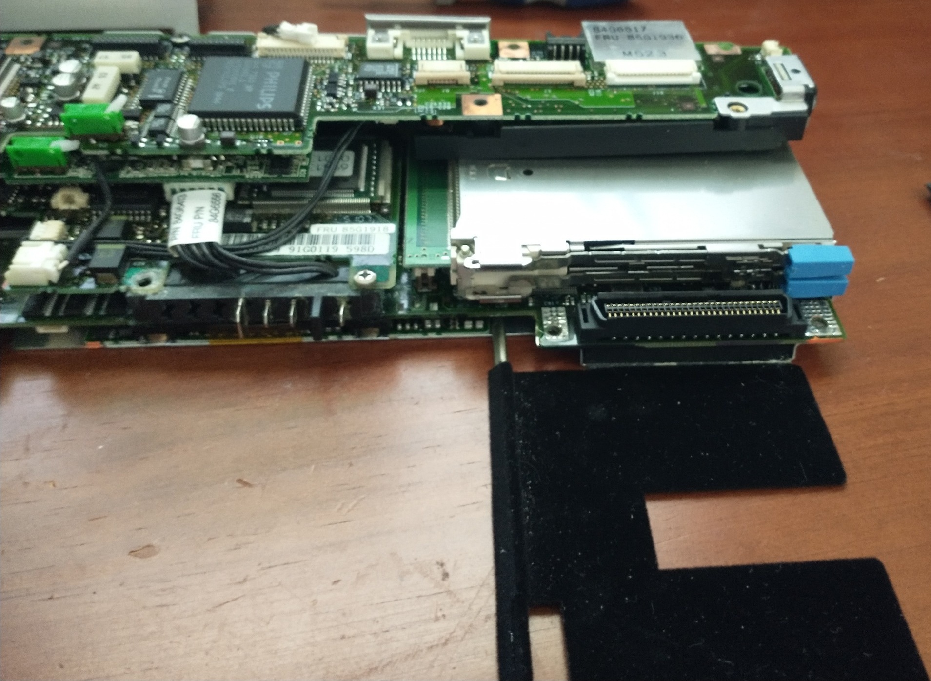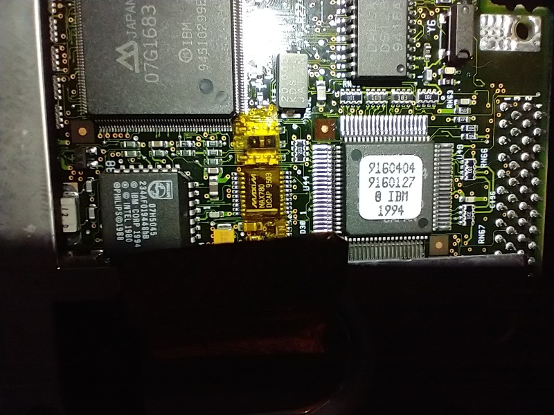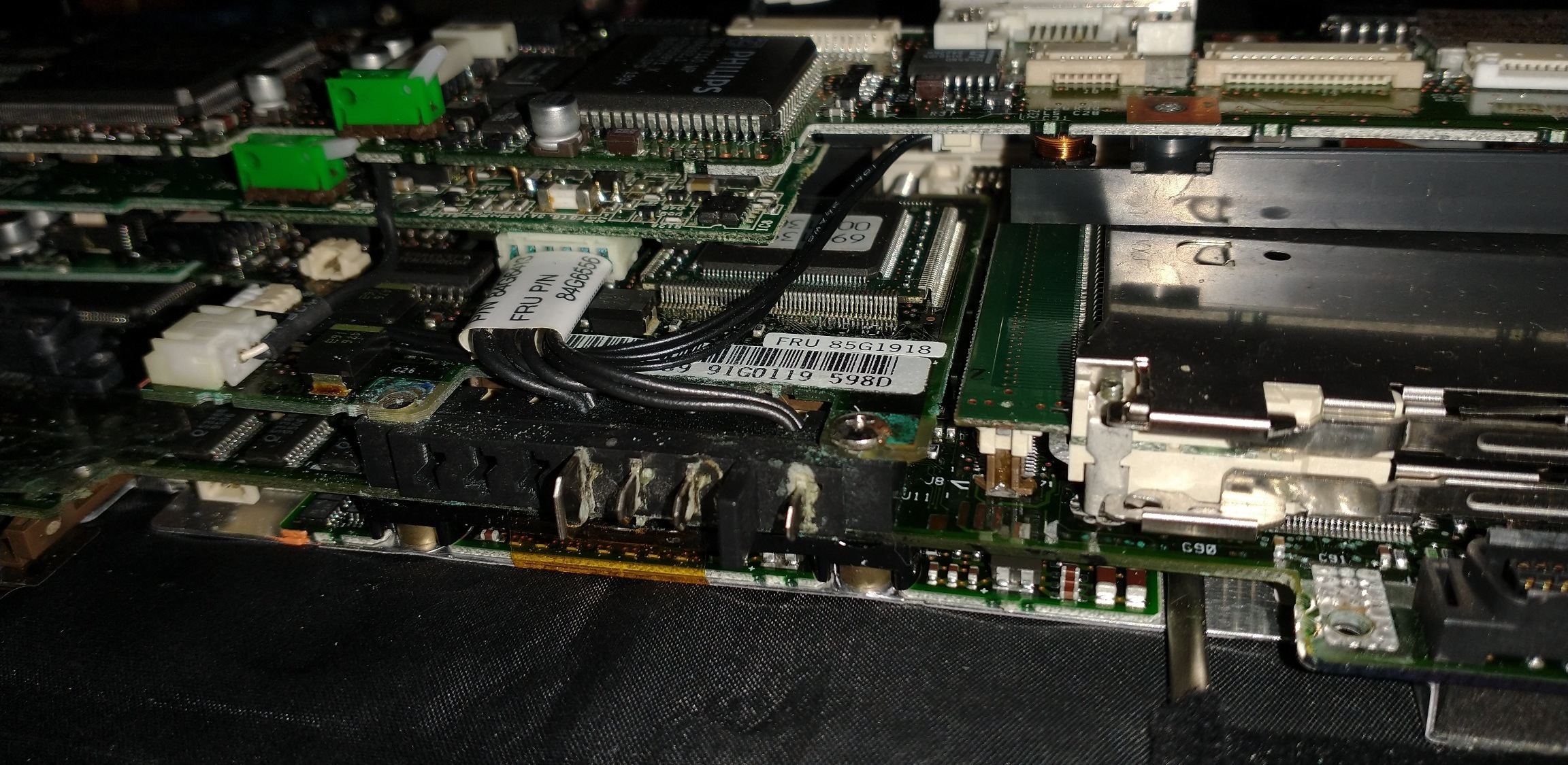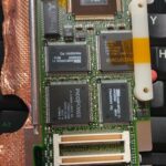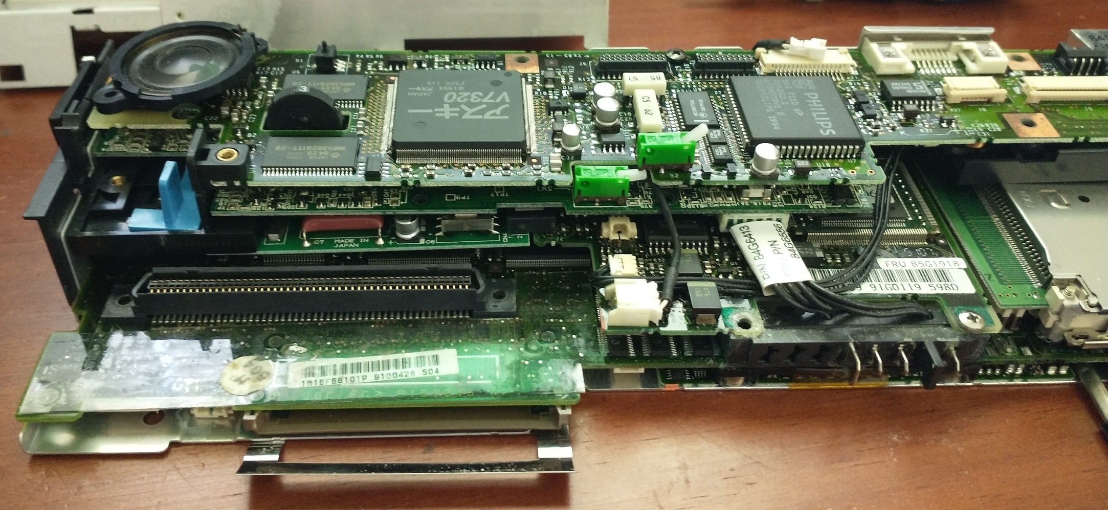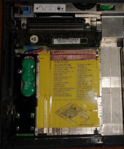 In several of these pictures, you can see how what happens when the main battery is ALSO a NiMH instead of a Lithium-Ion, and it’s left in the machine for 30 years. In this case, corrosion from both the standby and main batteries “wicked” through the cord and into various parts of the motherboard. There were still several good components in this machine, but it never booted properly. With a POST Card attached to the parallel port, I could see that it was actually going into an infinite boot loop, never making it to the visible part of POST! (A POST Card is a device which shows the various stages of the boot process, either via a digital readout or light pattern.)