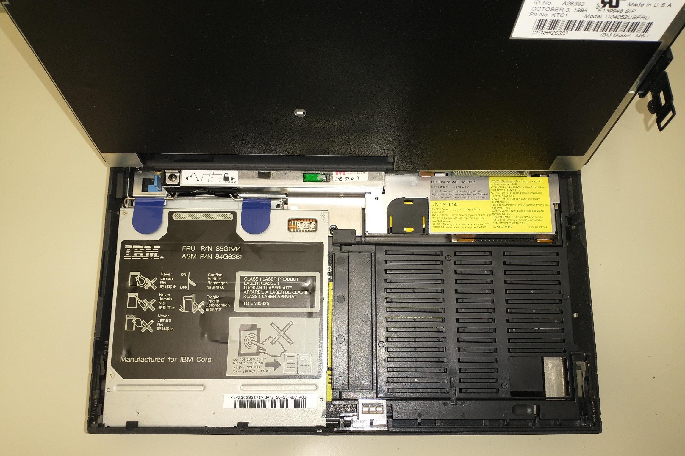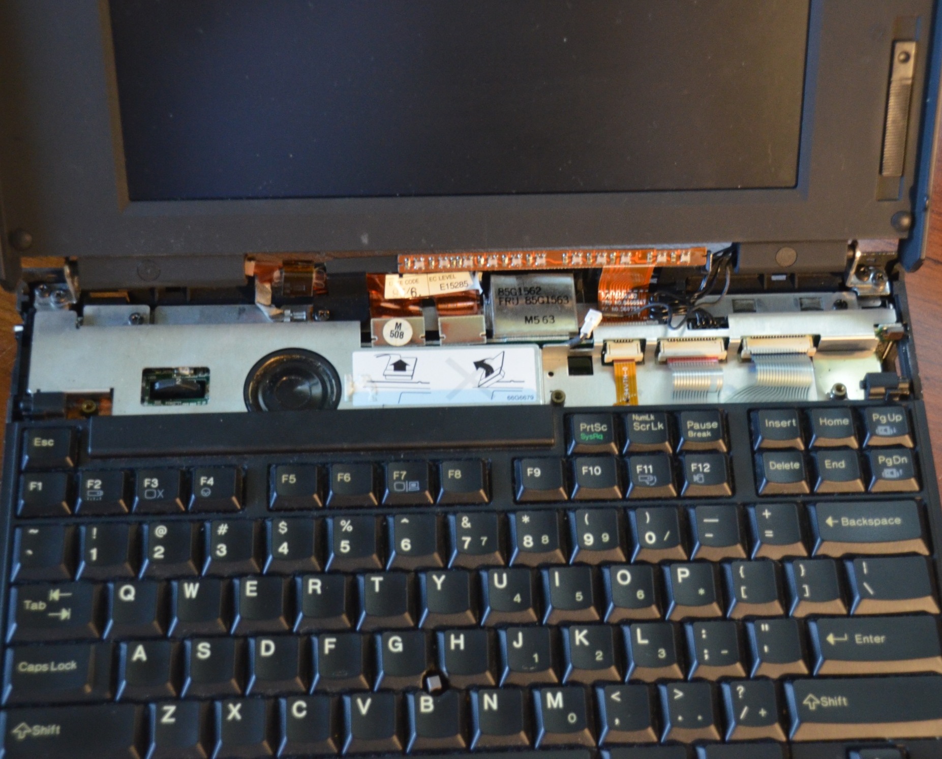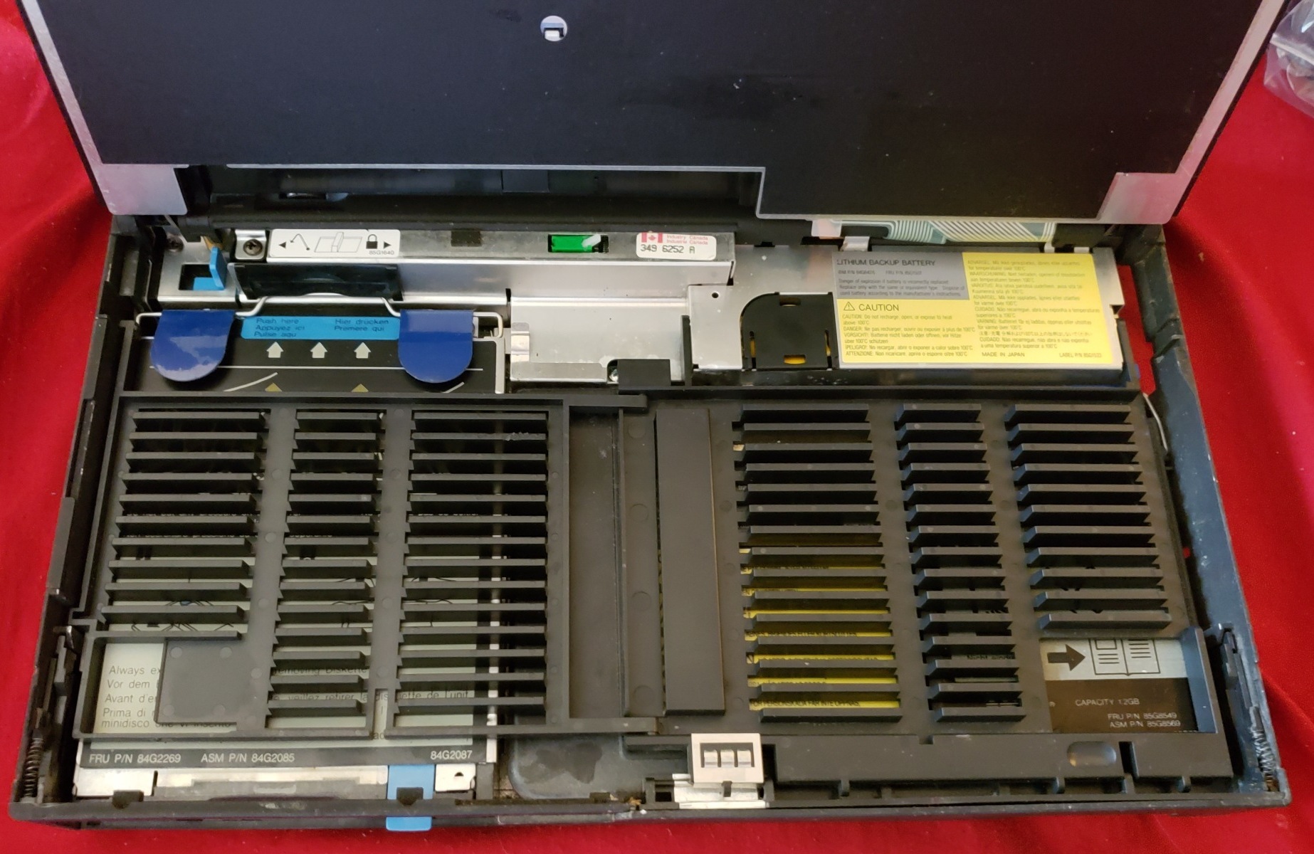 These laptops are serviced by lifting up the keyboard, which rotates upward like a car hood/bonnet. Once you do that, you can see the three main components: Floppy (or CD) on the left, Battery (NiMH or Li-Ion, depending on whether the machine is a 486 or Pentium) in the middle, and Hard Disk Drive on the right. Each of these is designed to easily lift out and be replaced, and you can slide a latch on the bottom (before attaching it to a Kensington Lock) to prevent people from easily removing the HDD.