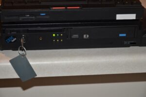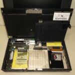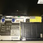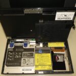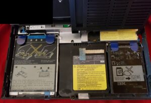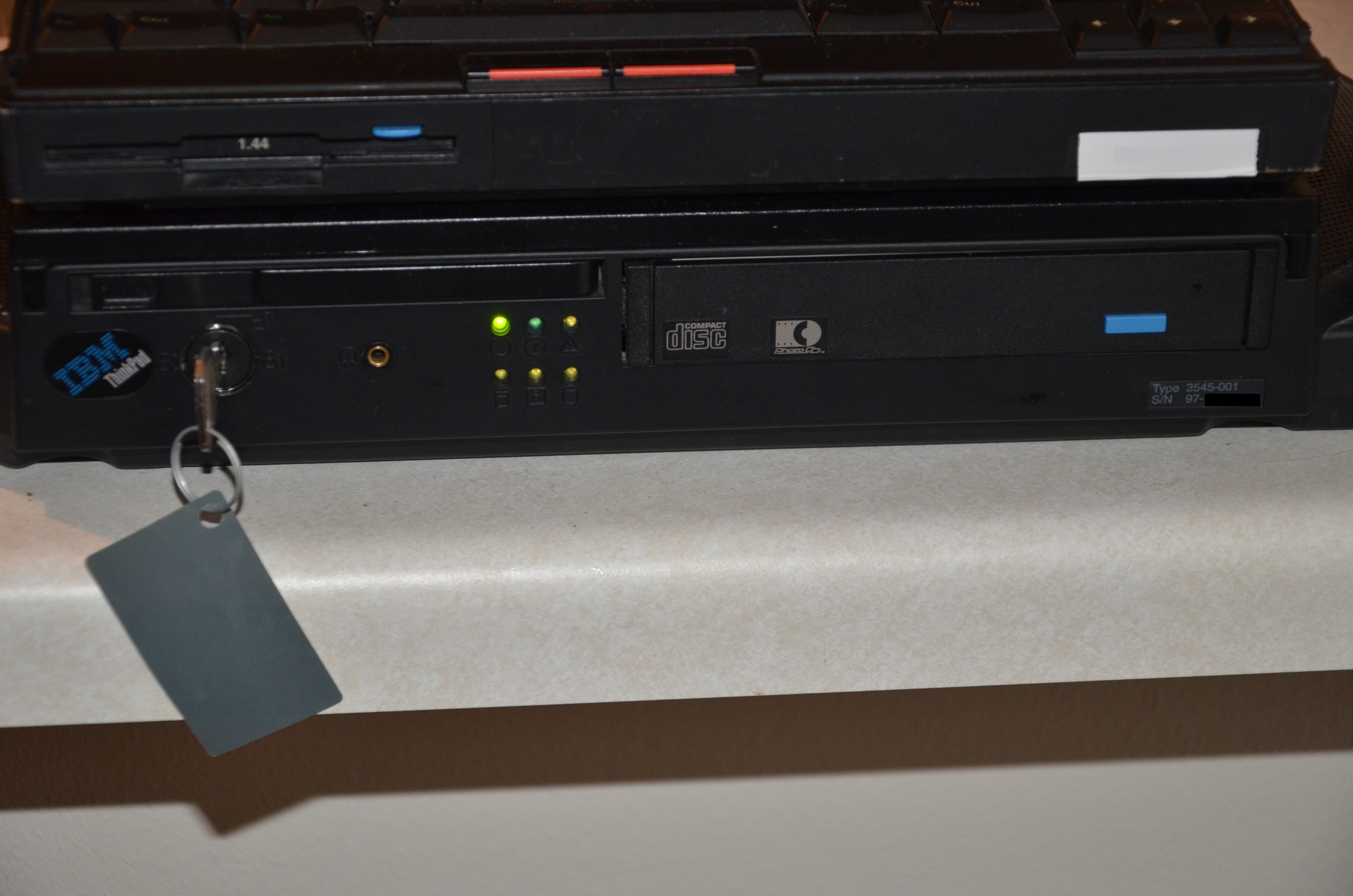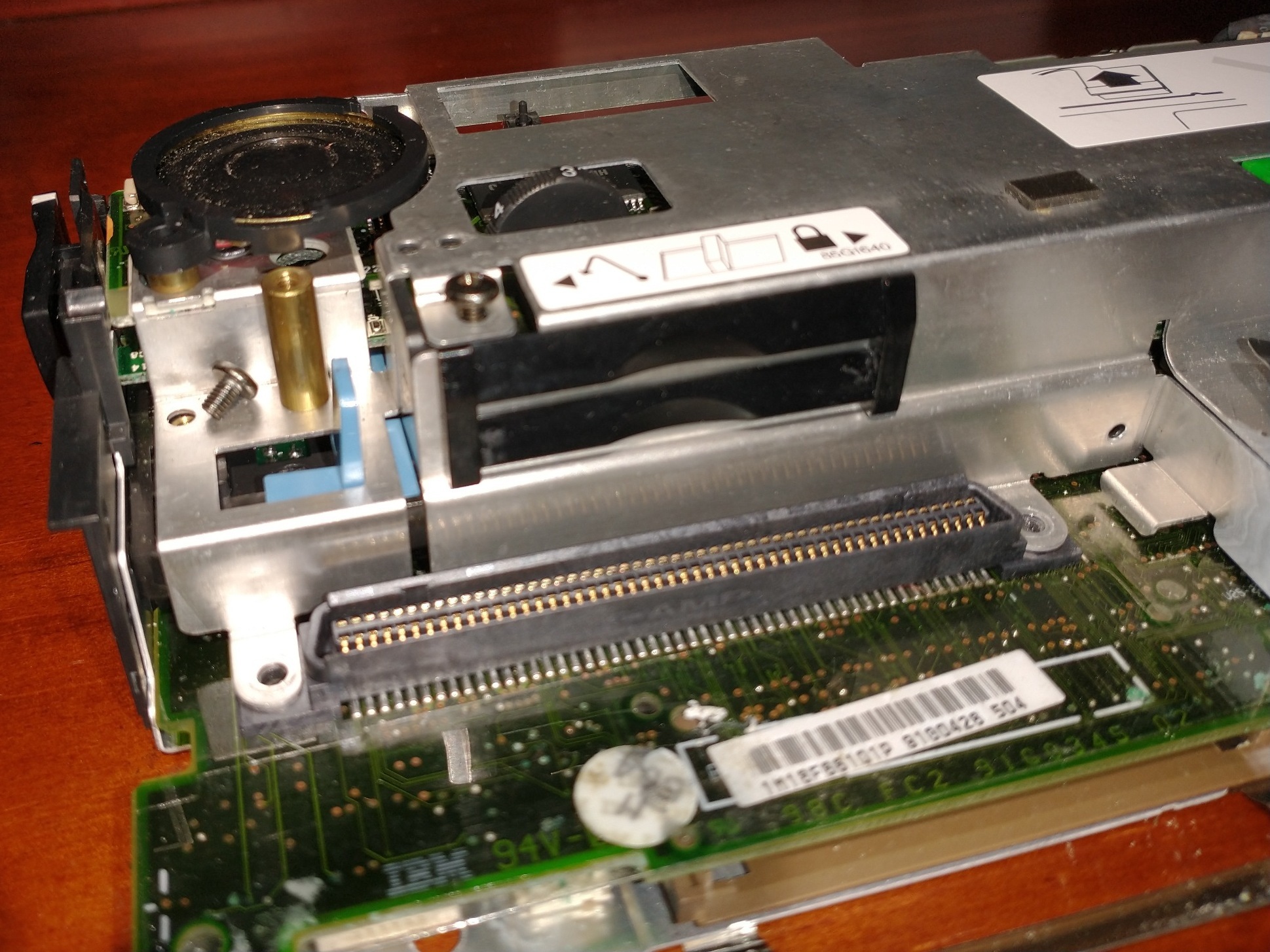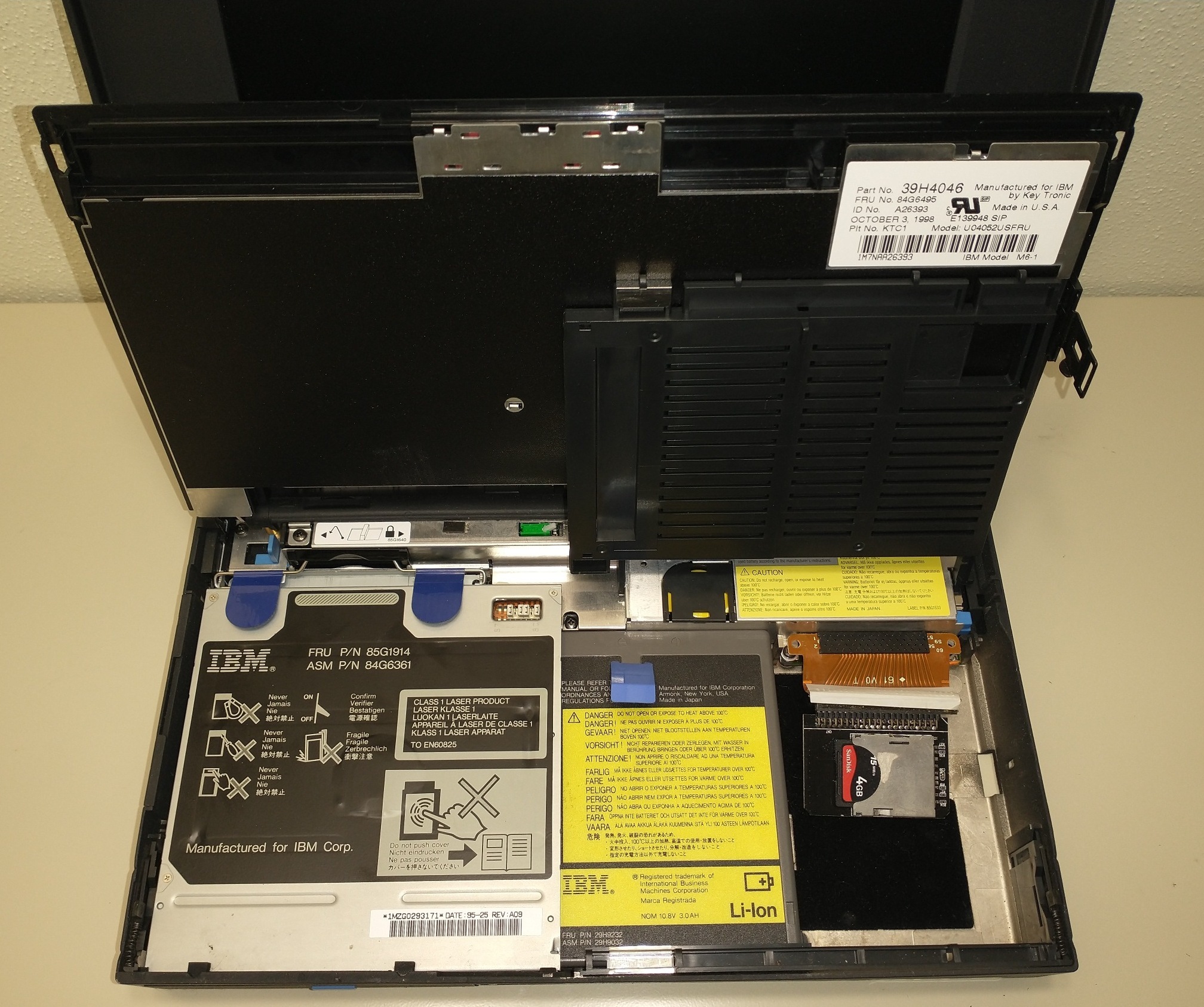 These laptops are serviced by lifting up the keyboard, which rotates upward like a car hood/bonnet. Once you do that, you can see the three main components: Floppy (or CD) on the left, Battery (NiMH or Li-Ion, depending on whether the machine is a 486 or Pentium) in the middle, and Hard Disk Drive on the right. Each of these is designed to easily lift out and be replaced, and you can slide a latch on the bottom (before attaching it to a Kensington Lock) to prevent people from easily removing the HDD.
