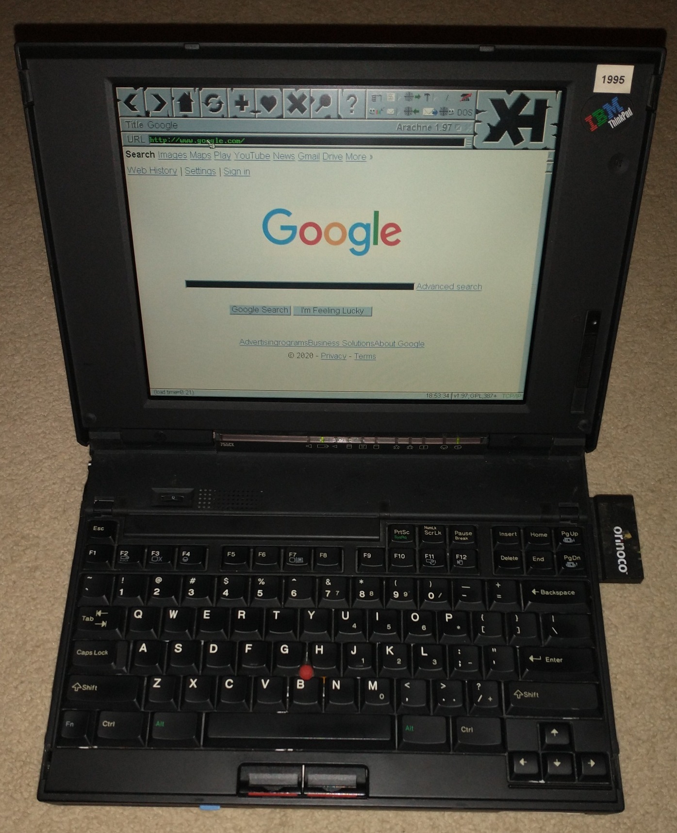 The 755’s PCMCIA slots don’t support CardBus cards, but they do support Type I/II/III PC Cards, like the Orinoco Gold Wi-Fi Card. Here’s a picture of my 755CX on Google.com (non-HTTPS) using the Arachne browser in MS-DOS, over Wi-Fi (2020); there is also a picture of me using Remote Desktop Connection to connect to a Windows 10 PC over Wi-Fi, all while using an original battery (2024).