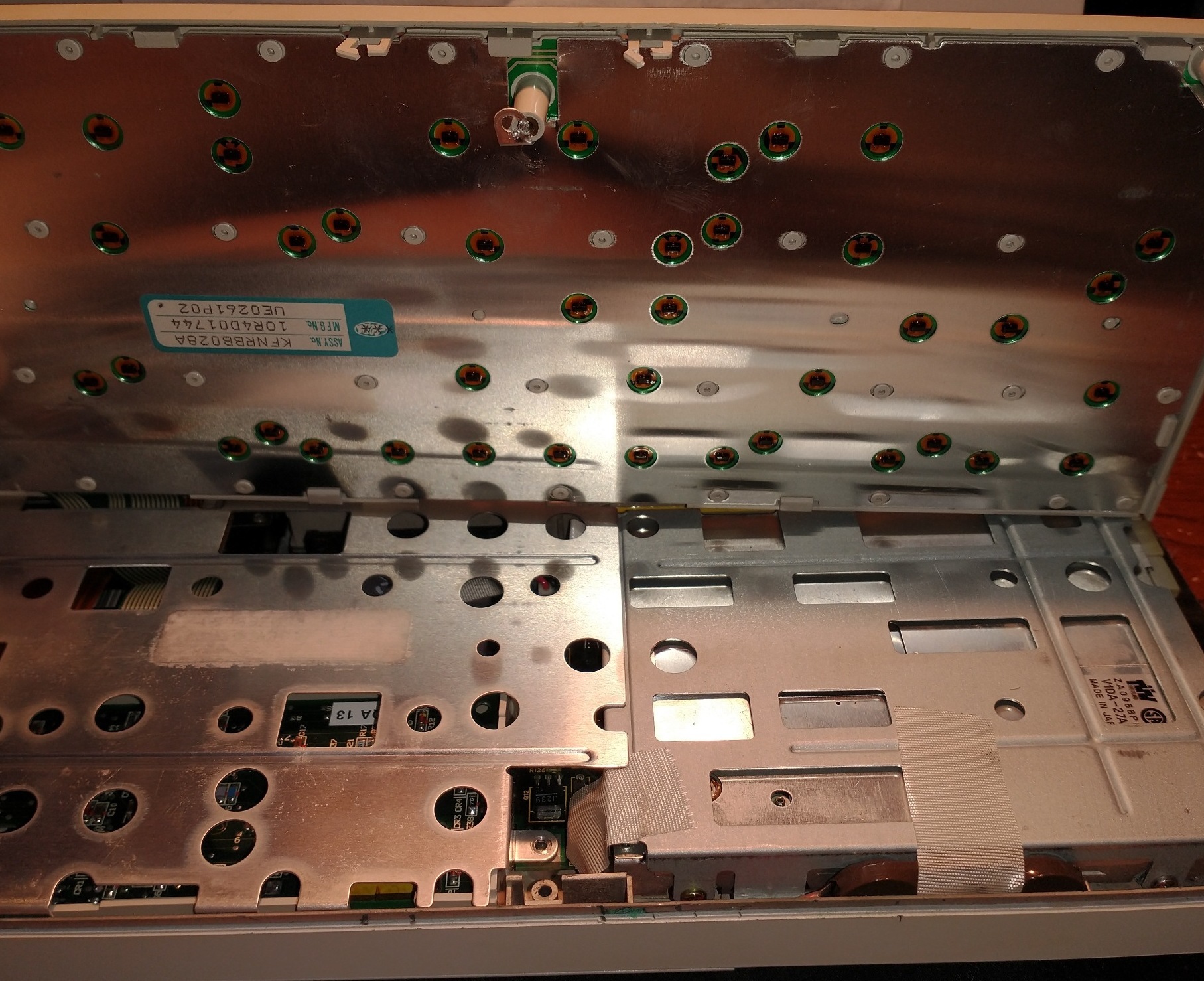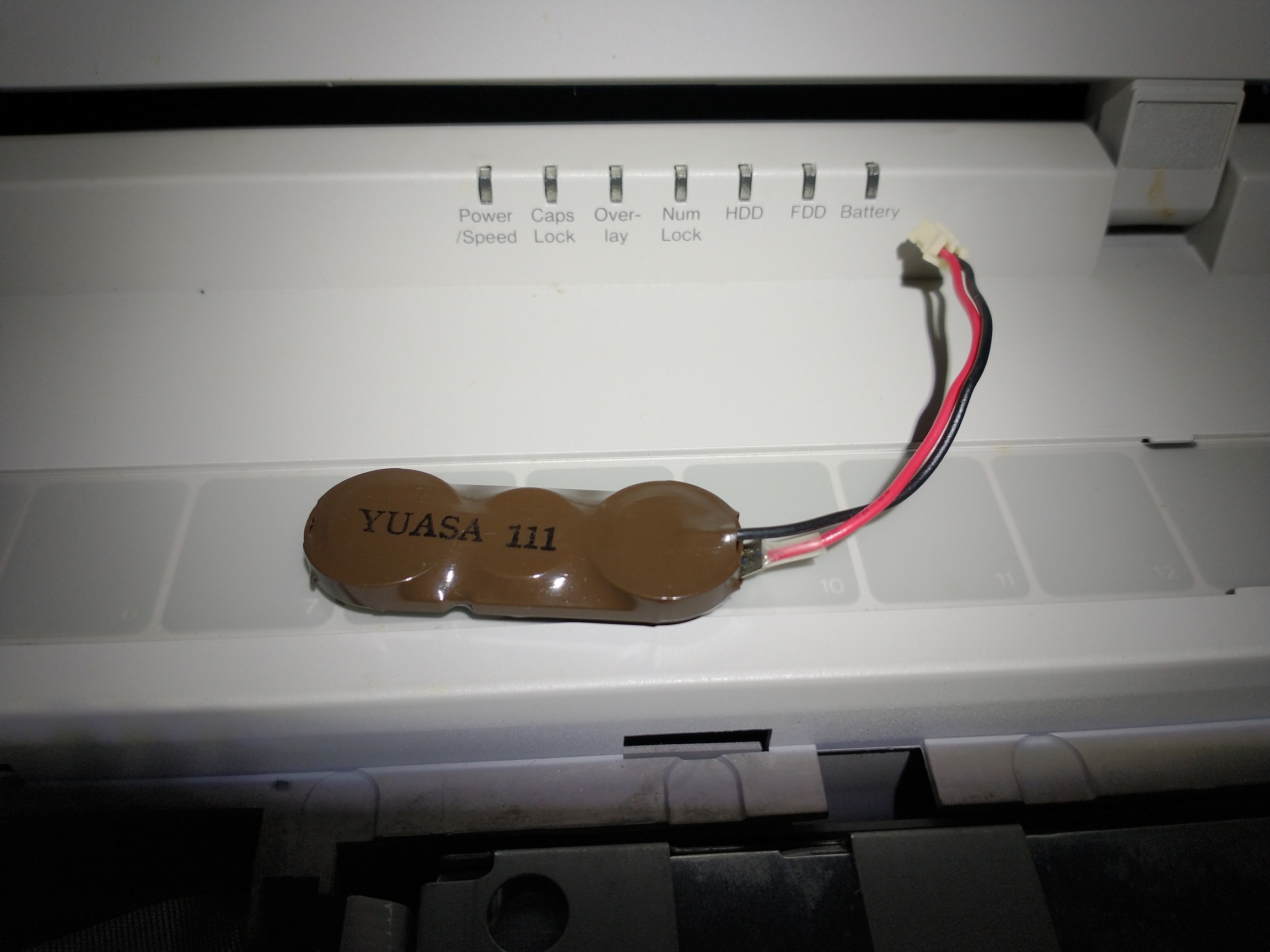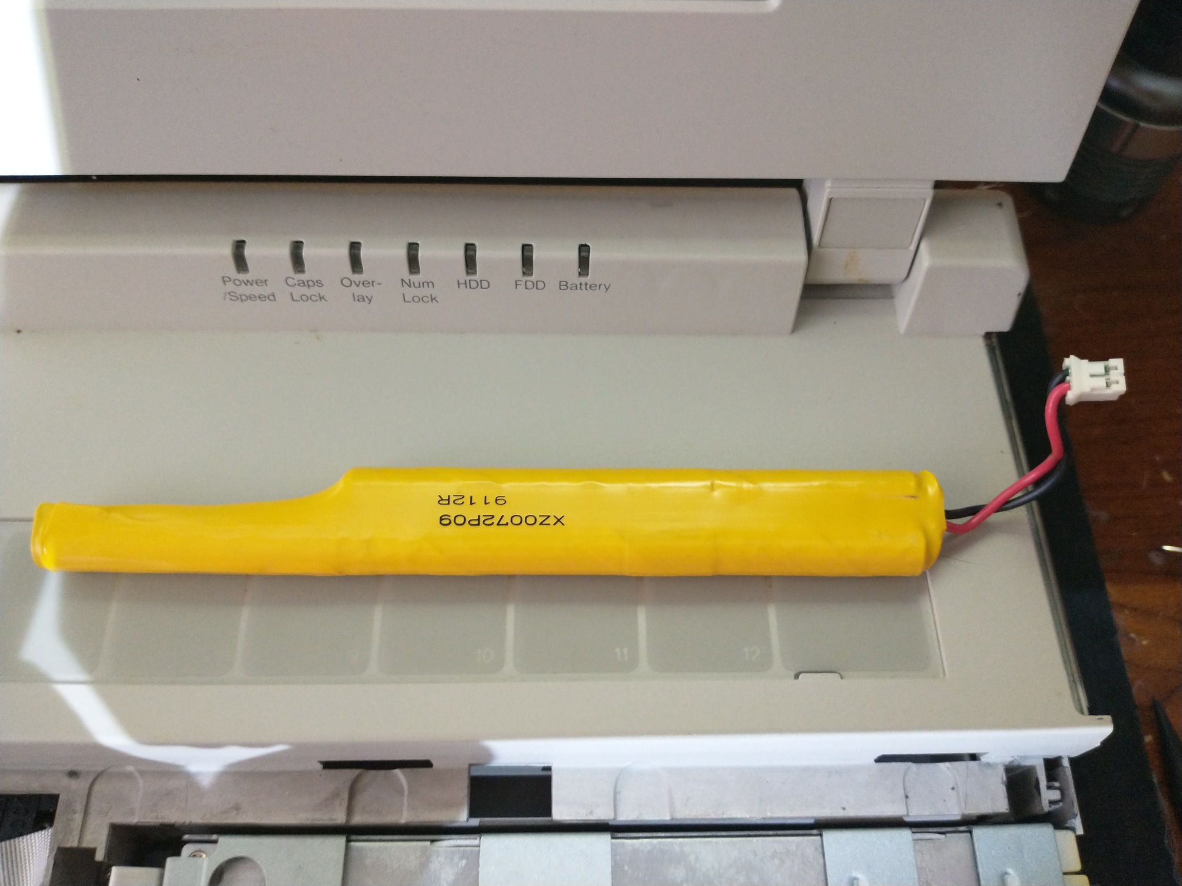 Like most Toshiba laptops of the era, this has a rechargeable RTC (Real Time Clock) battery, as well as a standby battery to keep the system running (in standby mode) while you are changing main battery packs. Unfortunately, these are known to leak eventually, so get them out while you can!
